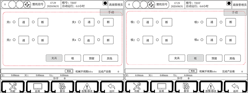 机械手系统型号为QC-S3G,权限切换到高级管理员身份,第一时间拨到手动状态下,治具页面设置,点击触摸屏右下角的按钮“夹具”和“吸”按钮分别进入治具的手动操作页面,如下图: