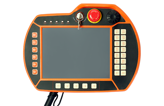 EC-RX系列机器人控制系统——为九州酷游(ku游)六轴关节机器人控制系统专用手控器,操作面板上的F1-F5按键作用,手控器上具体位置如下: