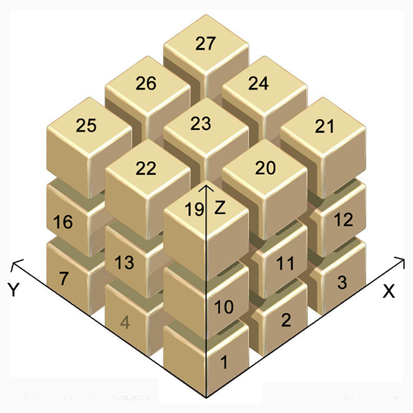 2、需要在XYZ方向上各堆3个产品,箱内总产品数为27个