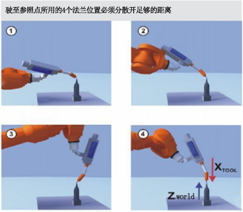 以控制点为基准设入4个不同的姿态的坐标位置,根据这4个数据自动算出工具尺寸。应把各点的姿态设定为任意方向的姿态,其中点4为工具尖端垂直于基准点的点,如果设入了偏向某一方向的姿态坐标,可能出现精度不准的情况。