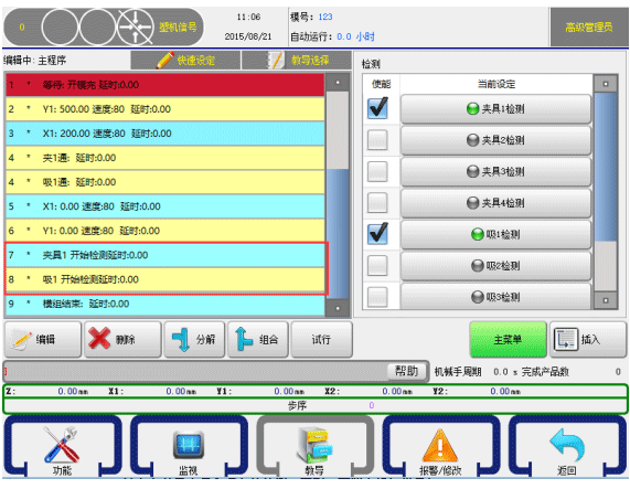 重要:当治具(吸或夹)断掉时,系统延时0.5S之后检测治具断,若治具检测仍然有信号,系统报警。若教导结束检测,系统不再检测治具是否有信号。