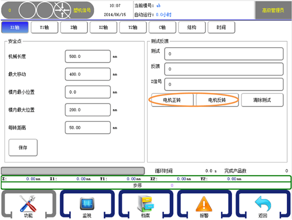 ② 按下【电机反转】,轴应该向原点方向走。【测试】数值 10000,【反馈】数值 55536